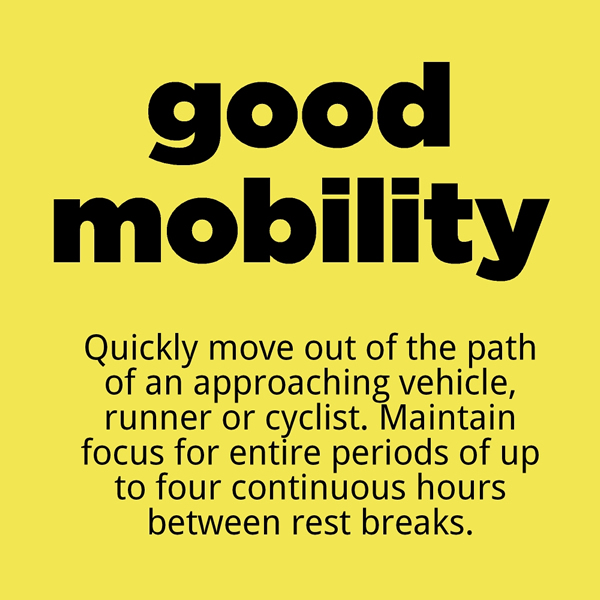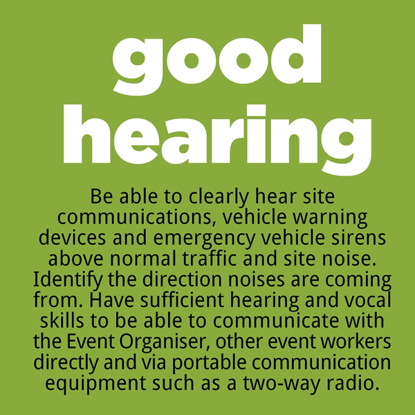 On event day you need to alert, aware and fully in the moment. Accidents can occur at any moment, and part of your role is to prevent accidents from occurring. We require good vision at all distances, excellent hearing, and the ability to communicate well with other volunteers, participants and the public.